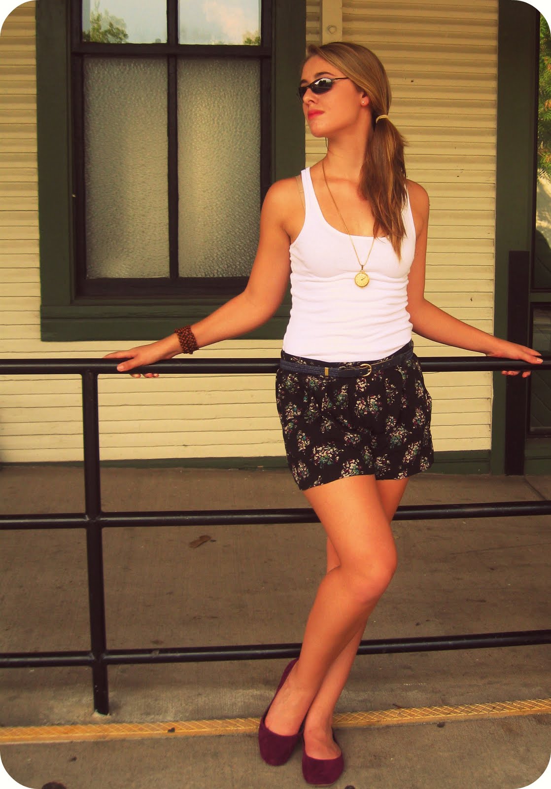 As it gets colder, this also looks quite nice with a black cardigan, and some sheer tights. Shorts (that look like a skirt!) Target, 15$. Tank, 5$ from Aeropostale. Vintage belt. 20$ flats from Rack Room. Shades lent to me from a very friendly stranger who struck up a conversation with us (mostly consisting of his life story), thanks Mark.